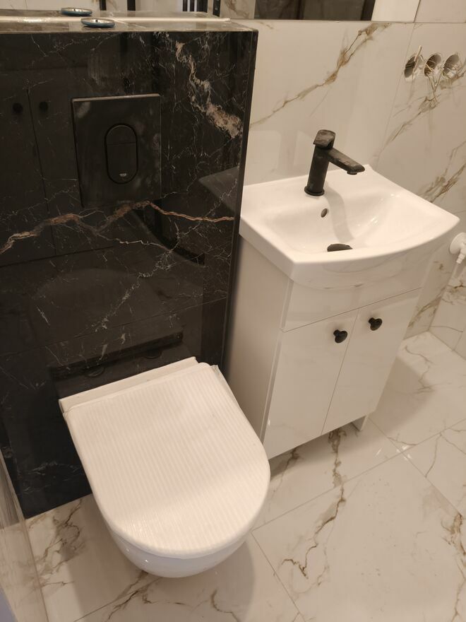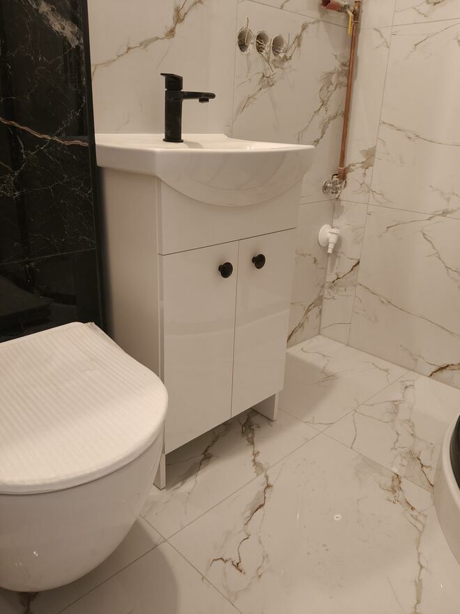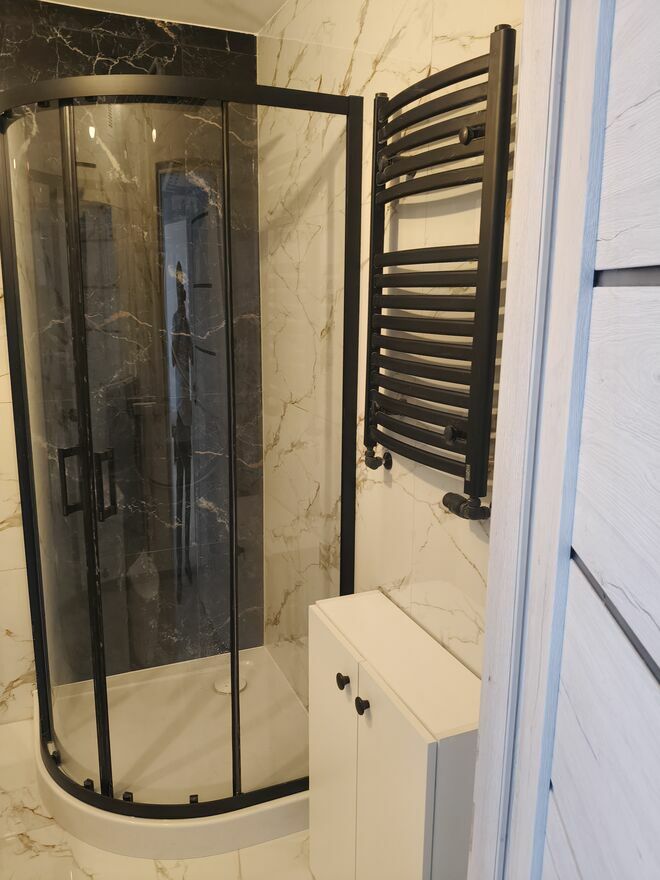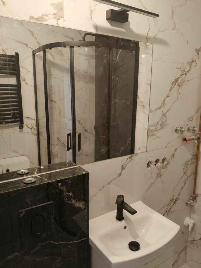 Łazienka- po generalnym remoncie, nowe płytki, toaleta, umywalka, prysznic wyposażony w deszczownicę, lampkę, dużym lustrem, kaloryfer typu drabinka, nowa instalacja elektryczna oraz wodno-kanalizacyjna, wygipsowana i odmalowana, wyposażona w pralkę, woda ciepła - nowy piecyk gazowy typu junkers, po przeglądzie, sprawdzono szczelność piecyka junkers, oświetlenie led, grzejnik nieopomiarowany.